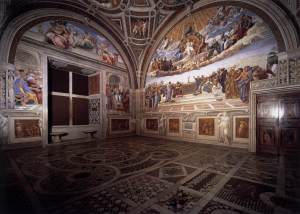 Il s’agit en fait d’un lieu clef du pouvoir au Vatican : salles de réunions, délibérations, bibliothèques, etc…Bien antérieures à Raphaël ces salles, les quatre Stanze, seront donc par leur architecture et leur disposition une contrainte incontournable pour Raphaël. Leur décoration avait dans un premier temps été confiée par le Pape JULES II à d’autres peintres (Vasari, Sodoma, Bramantino…) qui, par la suite, leur préféra Raphaël (introduit par Bramante).