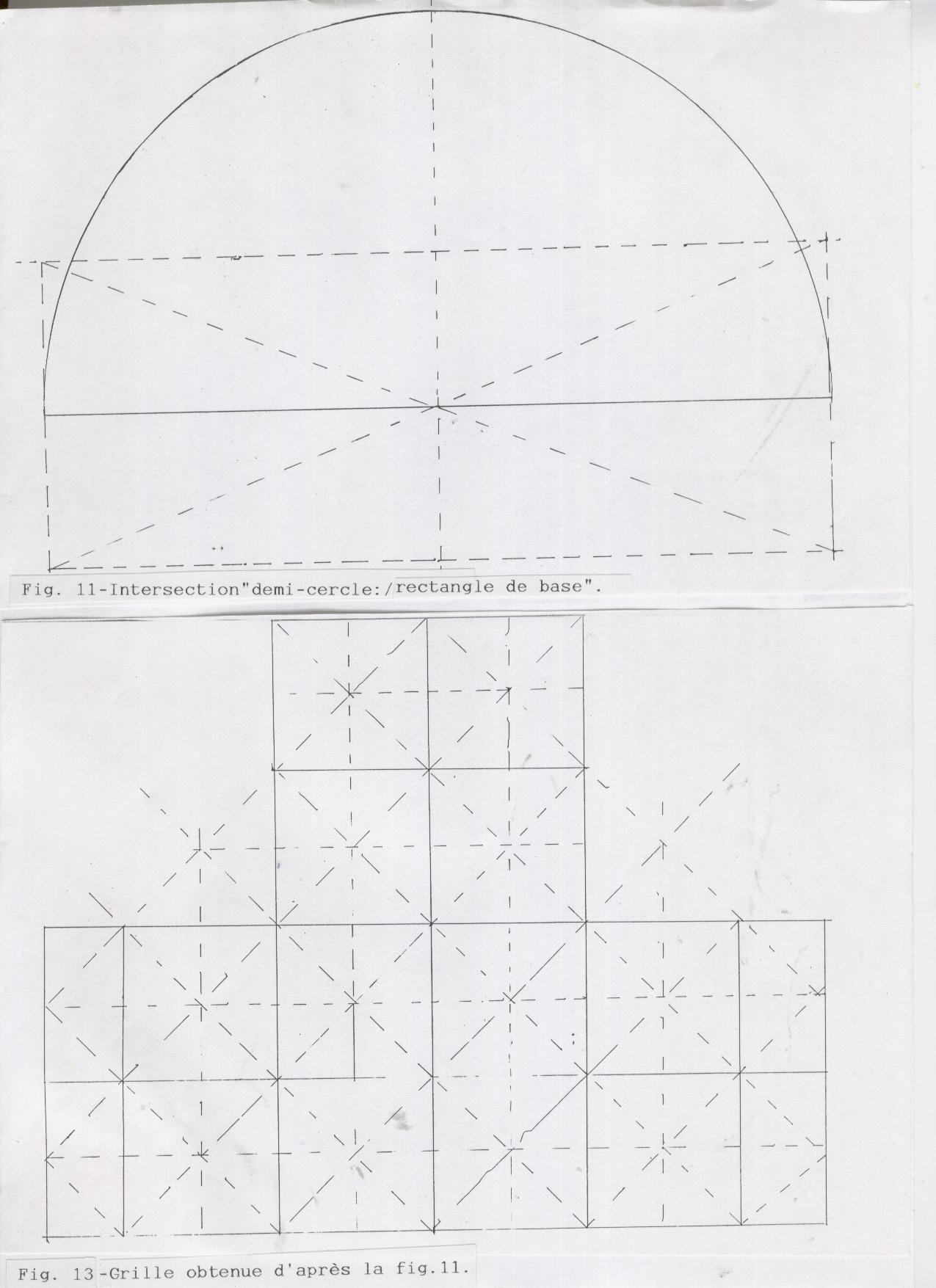 Si, utilisant ces constructions géométriques de base, on construit un Carré (ayant pour côté la largeur du rectangle) et si on le subdivise par diagonales, on constate, par superposition, l’adéquation parfaite avec le carrelage représenté en perspective[34].