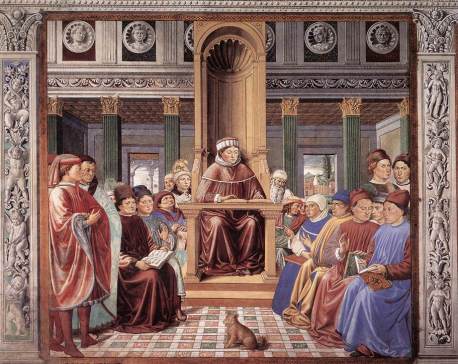 Gozzoli, St Augustin enseignant ; là encore l’architecture est le cadre nécessaire pour ordonner la diffusion du savoir. D’ Urbino à San Gemignano, on peut imaginer que Raphaël ait eu connaissance de cette œuvre!