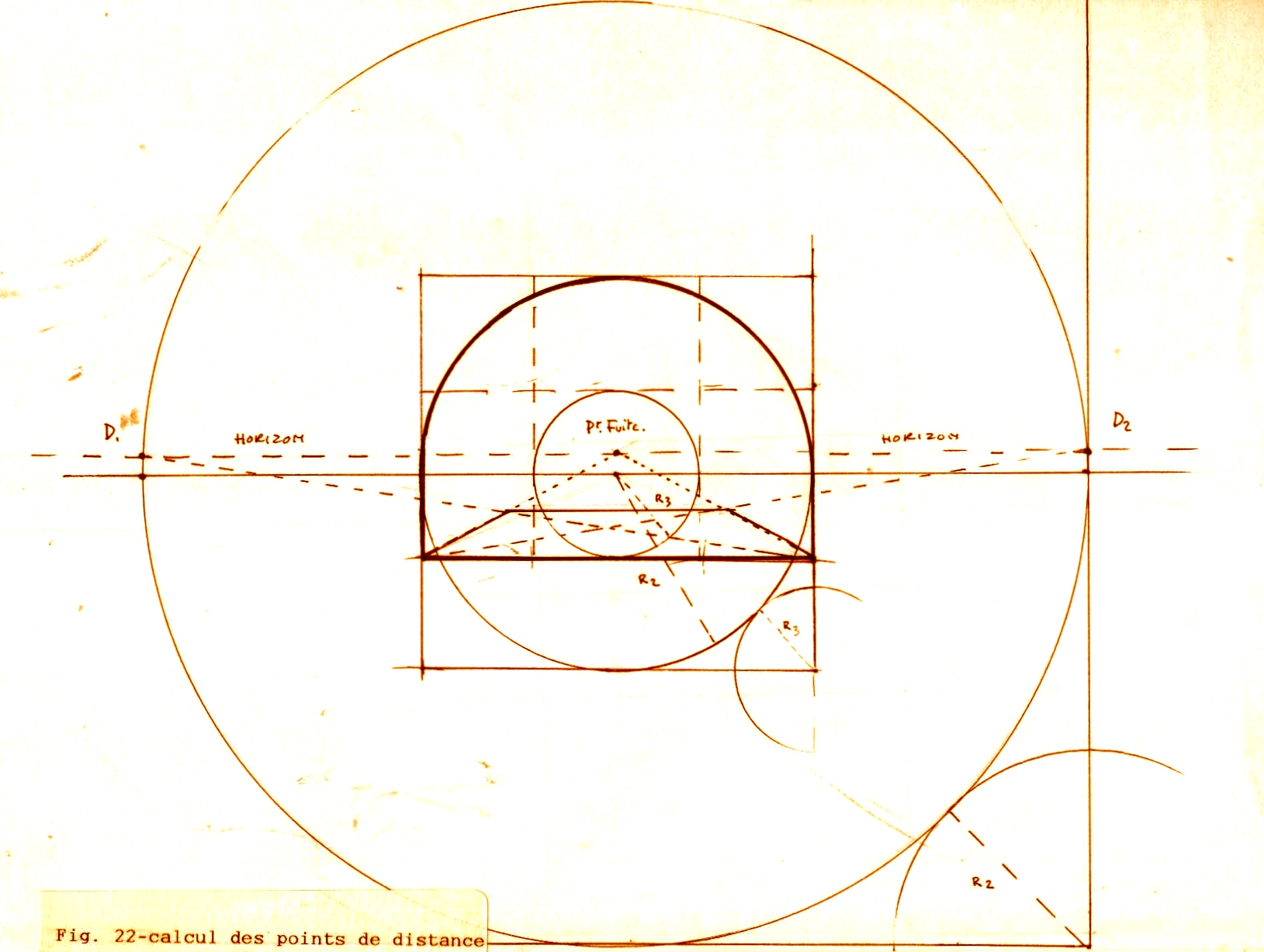 [60] Points de fuite à droite et à gauche du point de fuite central, déterminant la profondeur de champ, où plus exactement, l’éloignement du spectateur, relativement à l’écran de la peinture