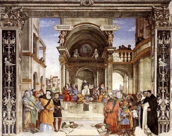 L’Eglise, et particulièrement l’ordre dominicain fit souvent appel aux artistes pour réaliser de véritables dissertations sur l’état du savoir et ses relations avec les traditions théologiques se référant, à l’Ancien et au Nouveau Testament, ainsi qu’aux débats en cours. L’importante série de peintures sur le thème de la Dispute ou le Triomphe de Thomas d’Aquin en témoigne et mérite d’être rappelée.