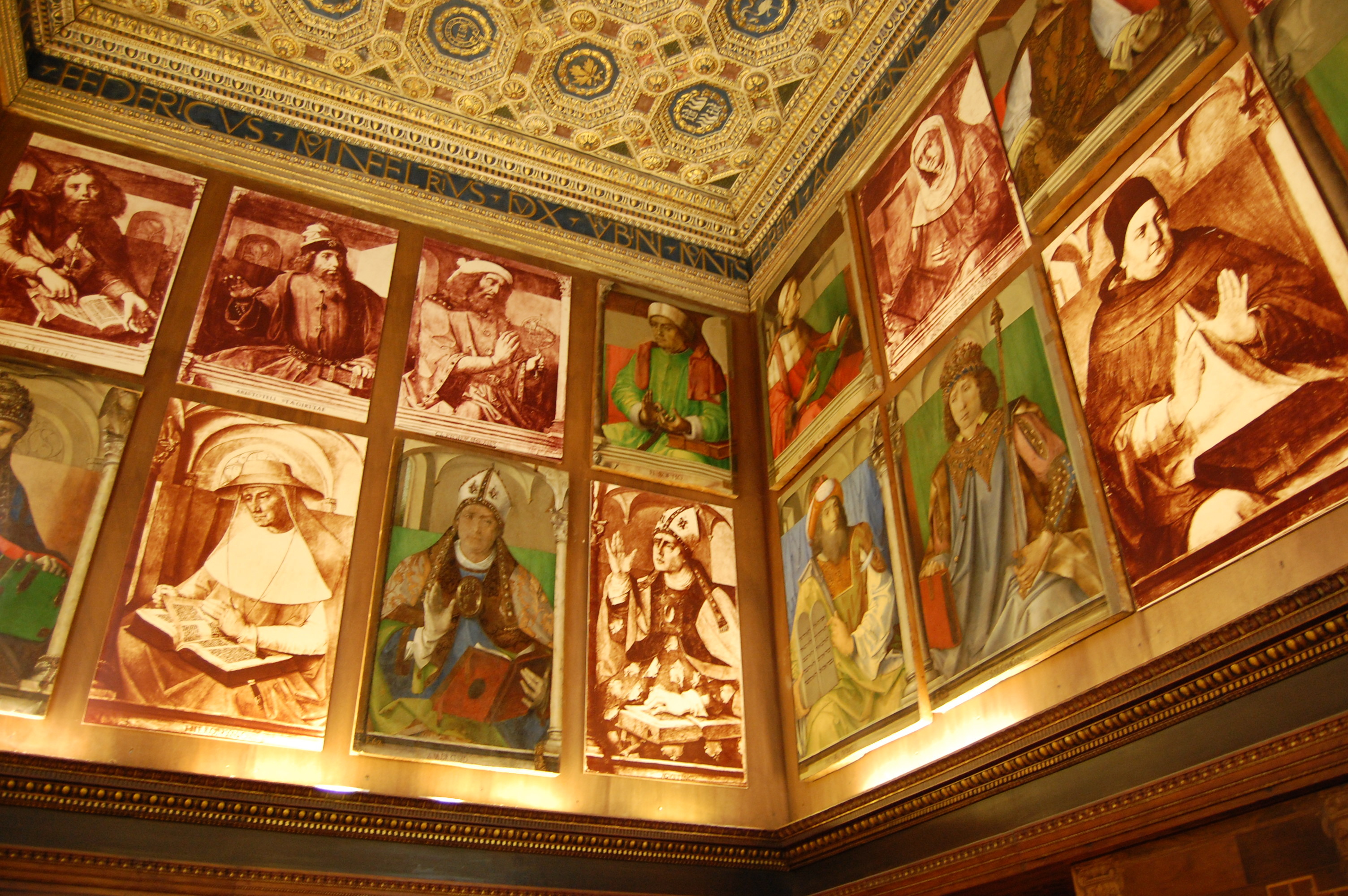 A Urbino encore, on peut voir une autre référence très vraisemblable de Raphaël : la galerie des 28 hommes illustres du Studiolo du Duc de Montefeltre.[10]