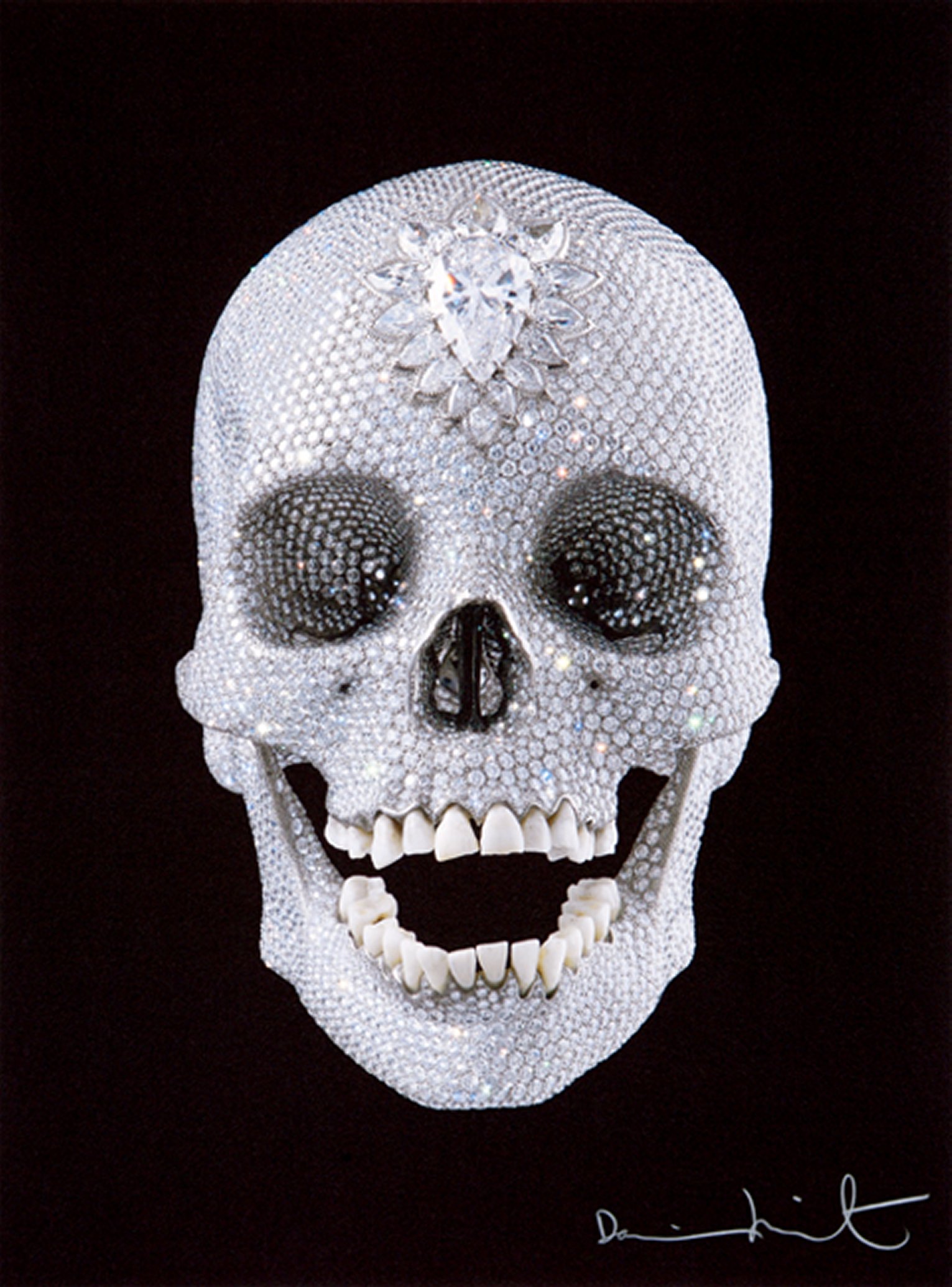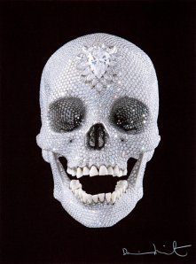 Crâne gigantesque en seaux à champagnes accumulés devant le Palazzo Grazzi, moulage d’un crâne humain incrusté de diamants d’une valeur de 74 millions d’euros, l’oeuvre, intitulée « For The Love Of God » ( avec un tel titre , on est sûr de faire du sens), est la copie en platine d’un crâne du 18ème siècle ( au 18ème les crânes étaient sans doute plus moulables), parsemé de 8.601 diamants, dont l’origine a été vérifiée pour s’assurer qu’ils ne proviennent pas d’un marché de contrebande ( sic) ( on a la morale qu’on peut ! ! !).
