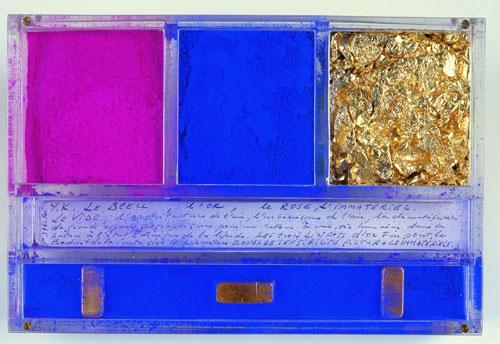 L’œuvre présentée par Debré a la F.I.A.C en 1996, en est une preuve évidente : présentée obliquement comme un plan incliné, cette très grande toile (7x3m) désigne l’espace tridimensionnel comme espace incontournable et nécessaire. Le corps prêt de basculer dans la toile de Debré est lui aussi bien présent chez Klein le mystique, judoka rosicrucien. Il n’aura de cesse de donner une réalité physique à ses purs monochromes. Que ce soit le dépôt légal de son fameux bleu, les matières et reliefs de certains tableaux (éponges. sables etc.) que ce soit les corps pinceaux ou mieux encore son propre saut dans le vide, jamais Yves Klein ne perd de vue cette dimension fondamentale de la peinture, qui participe de sa densité. Quand il utilise l’or, dans ses monochromes dorés, la part de réalité est suffisante, l’or étant matière avant d’être couleur ou lumière. Matière véhiculant mysticisme et vénalité, elle a par elle même une densité suffisante. Il semblerait donc que ce conflit violent, la quête de la sérénité par la pureté absolue en peinture, n’ait de solution que par l’acceptation en fin de compte de la part dénigrée et rejetée.