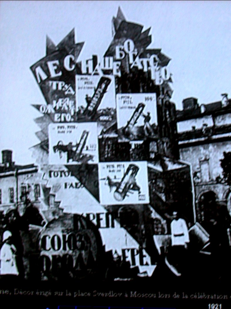 II faut mettre en parallèle la rencontre de Malévitch et Rodcenko ou Tatline et celle de Mondrian avec Van Doesburg ou Rittweld. Quel paradoxe en effet que de voir Rodcenko et Tatline, matérialistes et constructivistes reprendre le suprématisme à leur compte en le dévoyant et le développant. Pour eux en effet, la radicalité de Malévitch est la preuve de la matérialité brute de la peinture. Ainsi cette vérité du Carré blanc sur fond blanc, n’est pas transmentale, zaoumniste, elle est constructiviste. Elle révèle les qualités simples et propres du blanc, de l’objet-tableau, de la forme carrée, loin de toute illusion ou projection transcendante. Cette radicalité ouvre la voie à un nouveau regard brut mais enthousiaste sur les formes simples et les matériaux. “ Tatline et Malévitch étaient toujours occupés à partager le monde entre eux : la terre et le ciel ”(p.60). Ainsi c’est la confrontation avec d’autres artistes qui ici permet une dissociation et une répartition claire des domaines. Les formes simples et essentielles : carrés, cercles, triangles, deviennent les formes de la nouvelle esthétique révolutionnaire : des affiches aux brochures, des costumes aux sculptures et architectures. Les arts plastiques se mêlent à l’artisanat, la production industrielle, les arts dits Beaux :sculpture, peinture, architecture) se débarrassant alors de toutes références littéraires et spirituelles devenant un système théoriquement populaire sans connotations culturelles et accessible à tous.