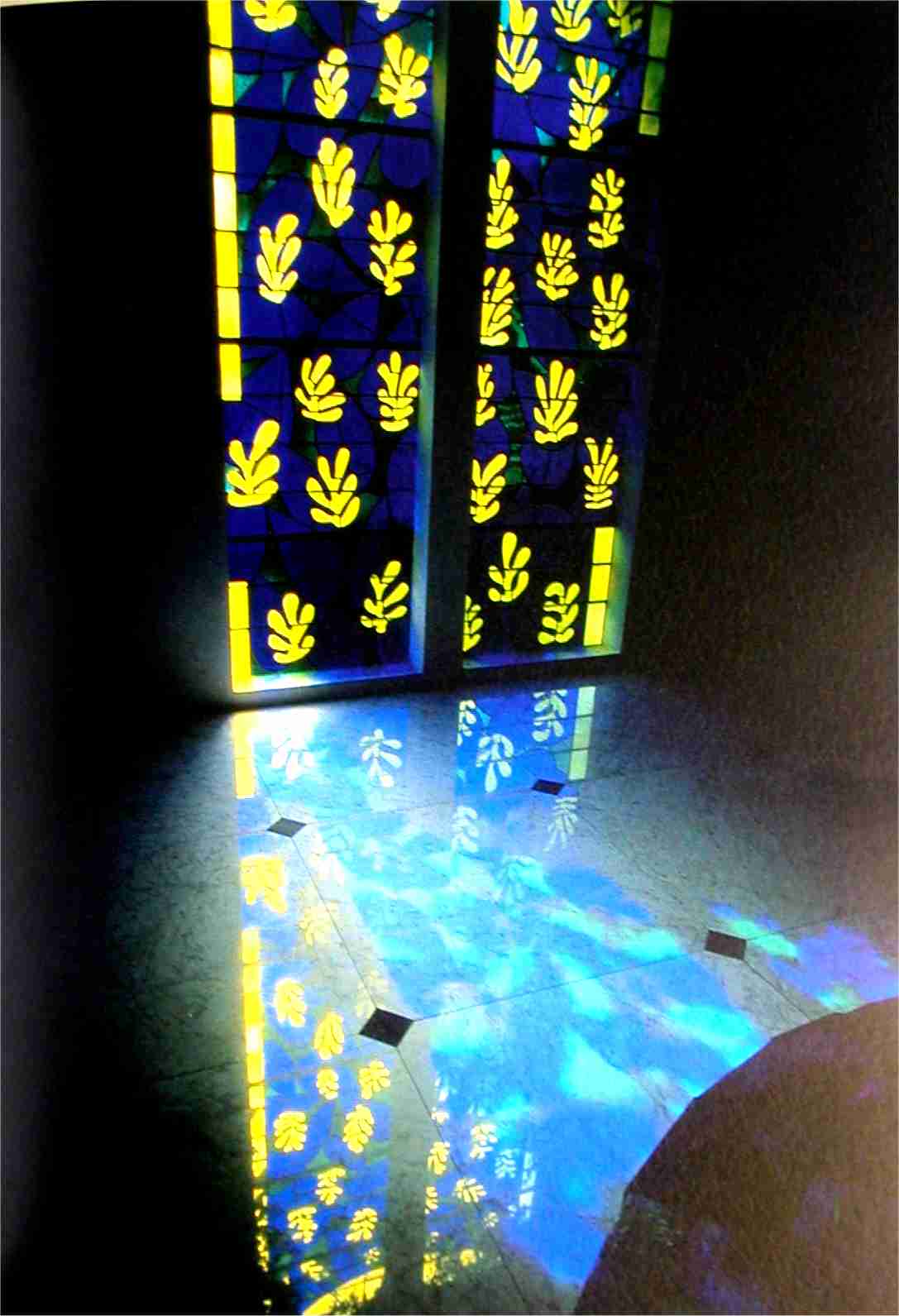 La réalité spatiale de l’architecture lui permet alors d’épurer au maximum sa peinture, les habits sacerdotaux des prêtres, peints par lui se meuvent avec lenteur, ce sont ses nouveaux poissons rouges : “ .le corps de la chapelle est placé sous le signe de l’espace sans limites d’un espace cosmique dans lequel on ne sent pas plus les murs que le poisson la mer ”, écrit Jean Luc Chalumeau (p.24.hist.crit.de l’Art cont, Klincksiek). Le vitrail est là comme le sommet de la pureté picturale pour Matisse dématérialisée, ou plutôt d’une matière toute baignée de lumière, non opaque comme une pierre de lumière. Il peut enfin réaliser une de ses plus anciennes ambitions, peindre “ comme si le soleil était derrière la toile ”. Le soleil derrière la toile, cela veut bien sûr dire : aucun modelé et pas de profondeur pas d’ombres portées etc. La couleur n’est alors pas d’abord matière avant d’être lumière/elle est d’abord lumière.
