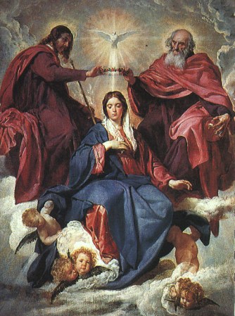 Vélasquez, le couronnement de Marie. Concept émergeant de l’immaculée conception, fusion des 3 corps et du St Esprit assimilé aux valeurs solaires et célestes. Figures coupées du monde sublunaire et terrestre ; couleurs vives. cœur céleste