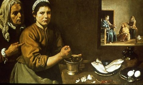 Vélasquez, Jésus chez Marthe et Marie, espace ouvert et fermé, lointain et proche. Artisanat et transformation de la matière au premier plan, discours, parole et abstraction au loin. Lumière terrestre et esthétique réaliste au premier plan, dilatation des corps dans la lumière au loin. Au centre, rien ; pas de hiérarchie