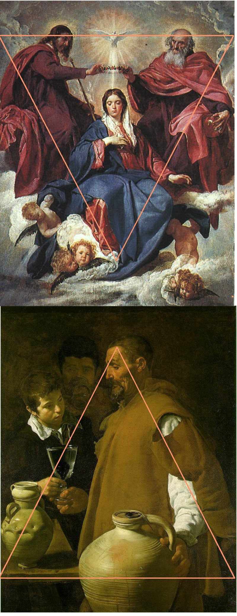 Ces deux pôles constituant l’univers de Velázquez sont manifestement dissociés dans ces deux œuvres : Le porteur d’eau (peint en 1620), construction pyramidale, espace clos, frontalité, relief accentué et modelés, rotondité, matières terrestres, visages réalistes et populaires, absence de lointains, complicité des regards, contraste remarquable entre l’aridité des terres et l’eau. Le couronnement de la vierge (1641) : Détachement du sol, ouverture vers le haut de la composition en forme de cœur (thèse de J. Gallego), peu de modelés, couleurs fusionnées, non dissociation des corps, liés par les drapés mêlés, lumière blanche et rayonnante, espace ouvert, cieux nuées et St Esprit solaire, figures idéalisées. « La couleur de ce tableau, avec ses tons de sang tranche sur les couleurs habituelles du peintre les critiques se sont étonnés de cette rareté chromatique, aucune ombre ne brise ces couleurs franches »[11].