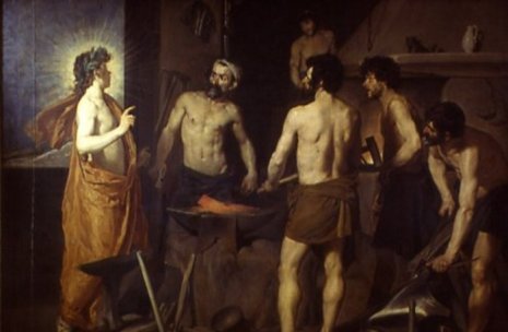 Vélasquez, Apollon et la forge de Vulcain ; là encore dispute esthétique entre les dieux, le solaire représentant l’esprit et la distance ; le terrien, boiteux, abîmé, travaillant, déclassé, assimilé aux lumières des feux terrestres. Castration symbolique, terre détrônée..