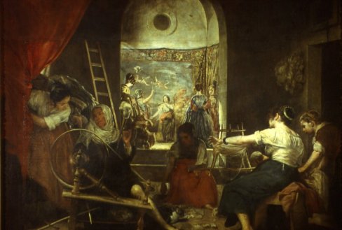 Peint en 1657, ces figures peuvent se voir encore comme un jeu sur les deux mondes. Le monde solaire et divin étant relégué au fond où la réalité se fond strictement avec la mythologie et l’illusion. Il s’agirait de membres de la famille royale visitant la manufacture des tapisseries ; mais leurs silhouettes se confondent avec les figures tissées ; mais cela évoquerait aussi l’histoire de Pallas et Arachné, Arachné jeune lydienne fille d’un teinturier, qui surpassant Pallas dans l’art de la tapisserie vit son travail, qui représentait les amours des dieux, détruit par cette dernière, qui la frappa de sa navette ; Arachné se pendit ensuite et fut transformée en araignée. Voilà encore une histoire conflictuelle des dieux et des humains. Cette scène ambiguë est repoussée au fond de la toile dans une lumière radieuse et dorée alors qu’au premier plan s’activent dans le monde réel, les fileuses, modelées par une lumière rasante, plus rare.