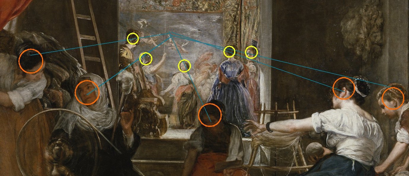 Vélasquez, las hilandras : chaque fileuse est reliée, au sens strict, par une ligne ( fil) de fuite, convergeant en un point de fuite. Tel une toile d’Arachné, bien sûr.Projection du monde divin/royal vers le monde terrestre/humain…Ici encore, l’envers des idées se dévoile comme une pratique terrestre et incarnée, le travail.