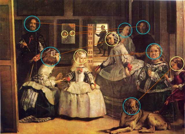 chaque figure est doublée, représentant clairement une existence terrestre et son double céleste/royal/lumineux. VélasquezPeintre, du côté de la matière et du dévoilement de la réalité de la peinture/Vélasquez chambellan,disparaissant vers la lumière cachée,au fond ; celle la même qui semble irradier le couple royal, au contraire du couple d’amis etc.