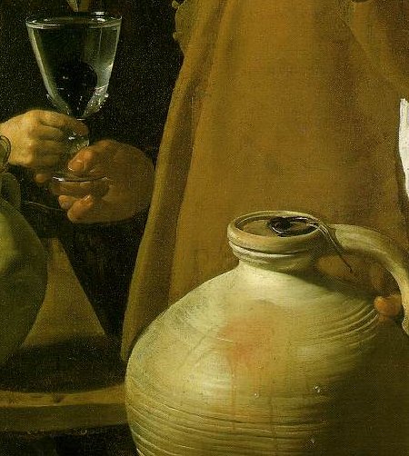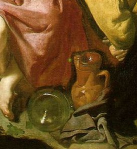 Vélasquez, détail central de bacchus chez les vignerons ; là encore, la double réalité des contenants, l’un terrestre et opaque, associé aux travail terrestre, l’autre cristallin et transparent, associé au Dieu..