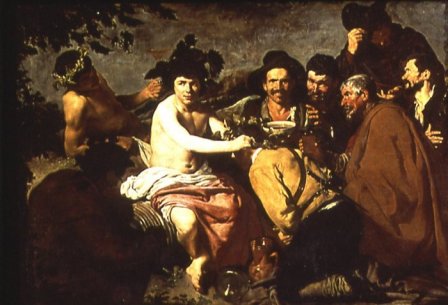 Vélasquez, Bacchus chez les vignerons ; dieux et paysans ; thème récurrent chez D. Vélasquez, on notera encore les deux bouteilles, l’une de terre côté des vignerons, l’autre, de verre côté de Bacchus, allusion claire aux qualités respectives de chaque domaine,là de nouveau, sans hiérarchies!