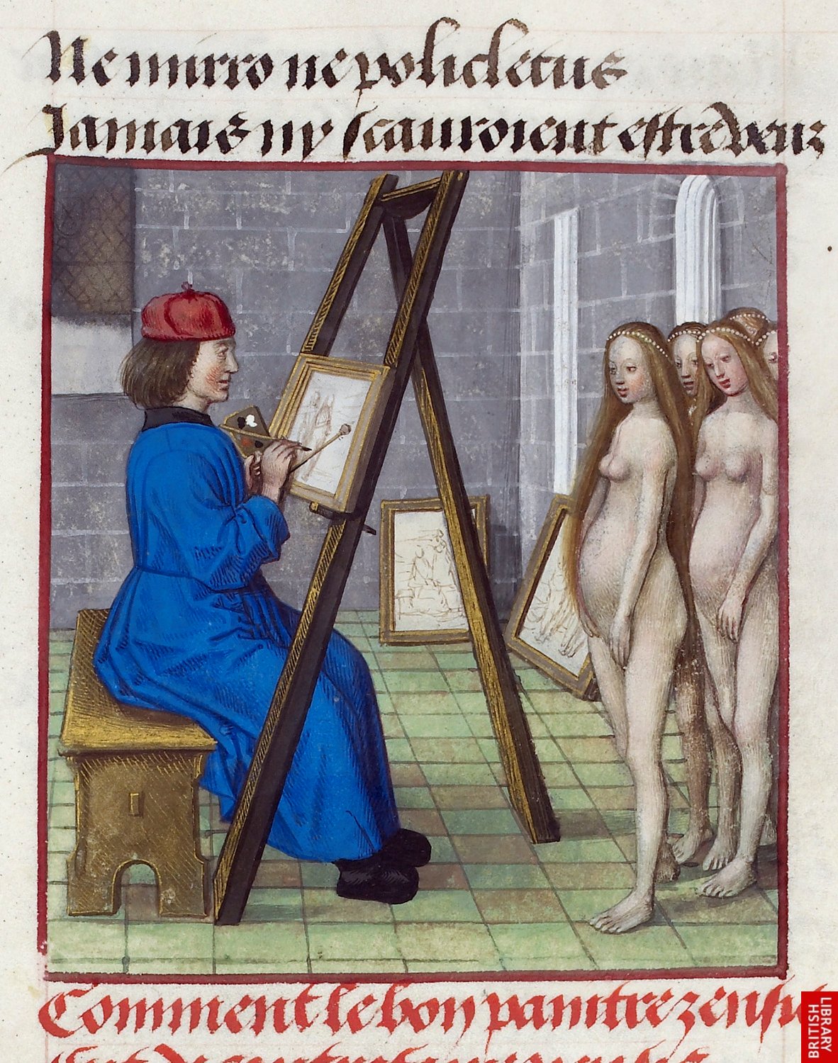 Dans le même temps comme l’écrit Michaël Baxandall2, les modèles sont repris et réévalués par les poètes et la phrase latine, la poésie des anciens, Cicéron et Horace est réévaluée, refaite. Les catégories du discours, la phrase périodique par exemple, comme les notions de composition, de varietas, d’imitation, de mesure, de clarté et de sens sont organisées. Cette quête de règles, de normes reprend bien sûr les modèles antiques des arts plastiques comme Appelle et Zeuxis, Praxitèle et Phidias. Ces fameux et trop fameux Zeuxis et Appelle, peintres d’autant plus fameux que pas une peinture ne peut leur être attribuée, sont les références incontournables de l’époque pour tout auteur abordant la vie, l’imitation, l’habileté, l’illusion, l’idéal.
