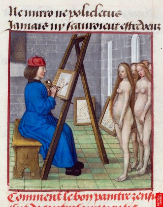 Les anecdotes ressassées, devenant elles mêmes modèles de discours sur les arts et les mérites comparés (le paragone)de la peinture et de la sculpture sont bien connus, comme celle d’ Apelle et de ses raisins trompant les oiseaux, ou de Zeuxis choisissant 5 modèles de femmes pour atteindre le type idéal de beauté.