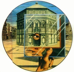 Au dessus du baptistère qu’il a reproduit fidèlement selon des règles optiques de la perspective linéaire (artificielle) il dispose un miroir, qui reflétant le ciel et les nuages, restitue la parfaite illusion. Il y a bien deux domaines ici délimités : le sol et l’architecture d’une part, qui sont quantifiables et mesurables et le ciel qui échappant à la mesure, échappe au dessin.
