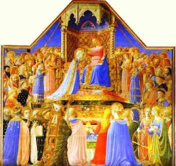 A sa manière, c’est aussi l’œuvre de Fra Angelico qui , maître de la perspective reconnu comme tel , fait disparaître tout espace construit dans le couronnement de la vierge, cassant la succession des plans par des auréoles non elliptiques et dorées, cassant les reliefs par ses marbres colorés, baignant les corps dans une lumière irradiante et diffuse. La aussi, quasi absence d’ombre propre et portée ; déni de l’inscription de ces corps dans l’espace ; l’intensité des couleurs comme négation des modelés ; c’est-à-dire de leur caractère de masse pesante ;