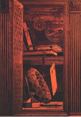 La perspective en marqueterie, usage fréquent pour trompe l’oeil virtuose. Panneaux du Studiolo d’Urbino de F. de Montefeltre.