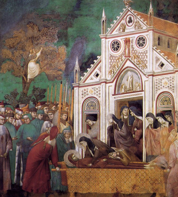 Mais la vision de Giotto sur François tend à modifier l’approche théologique de Jésus ; en peignant la vie de son compatriote et presque contemporain, il l’institue en nouvel exemple, en modèle proche. François d’Assise renouvelle radicalement un christianisme sclérosé et hiérarchisé. Celui-ci s’était installé dans une distance croissante prise dans le temps, avec la figure d’un christ de plus en plus lointain ; cette distance théorisée par l’art gothique, élevant la figure jusqu’à l’abstraction et à la puissance triomphante, fusionnée avec la puissance du père, sans degrés. La distance est encore entre le message d’origine, pauvre et humble et le système clérical fermé et opulent.