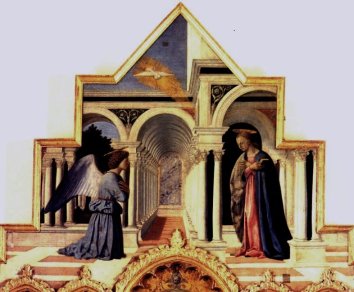 Piero, annonciation..la trouée vers le plan de marbre, au fond du corridor, nous plonge vers un point de fuite encore voilé…métaphore du repère à venir, le messie des chrétiens ayant charge d’ordonner le monde.