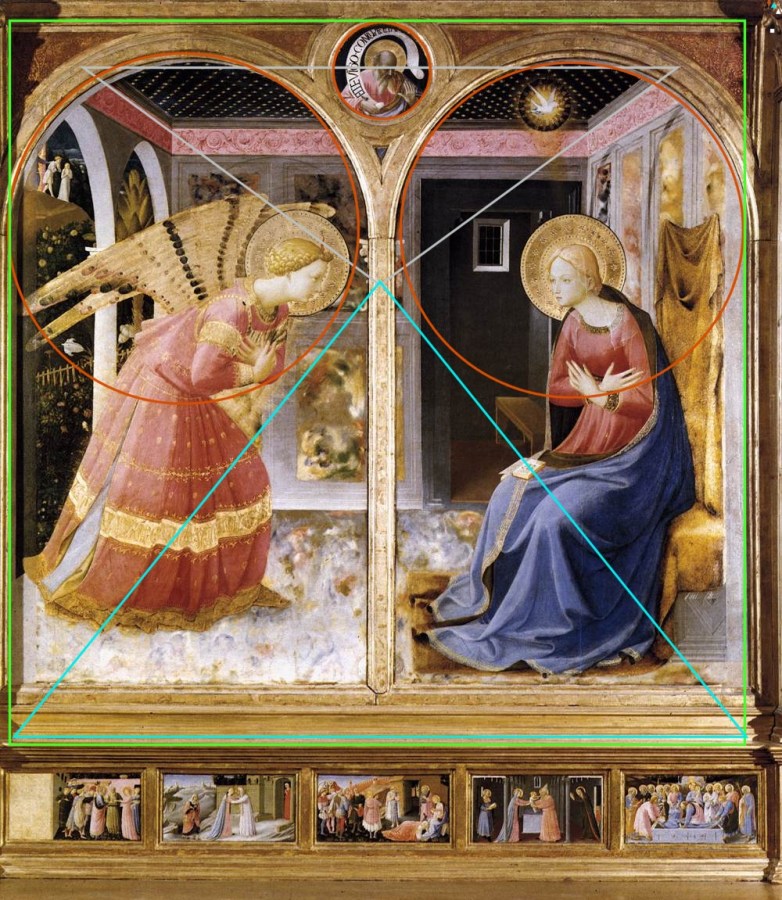 Angelico, Annonciation ; là, l’ordre est complet, la symétrie, la place du point de fuite partage les protagonistes sous le regard englobant du créateur, surveillant son dispositif messianique. Il y a bien, le jardin d’Eden abandonné et la fenêtre d’ou viendra le sauveur.