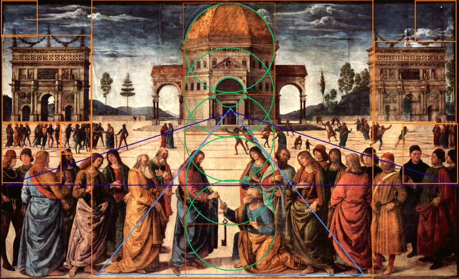 Le même principe, encore appliqué à la question théorique de transmission et de contact : le lien terrestre, à savoir la remise des clefs, permets l’édification au sens strict d’un temple dont l’ouverture est désignée encore par le point de fuite. Articulation claire avec les formes parfaites des triangles équilatéraux, cercles et carrés.