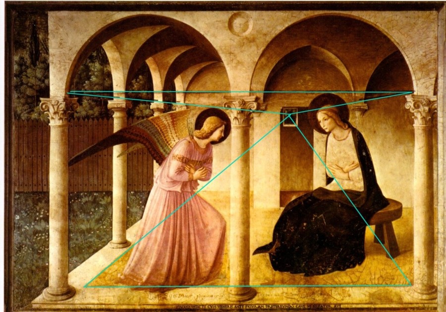 Angelico, Annonciation, ici le point de fuite est clairement sur la fenêtre, du côté de Marie, clairement, le messie à venir est issu de la nature brouillonne associée à l’ancien testament ; il a pour vocation d’apporter un nouvel ordre, par l’architecture et le jardin ordonné. La palissade derrière Gabriel signifie déjà cette césure.