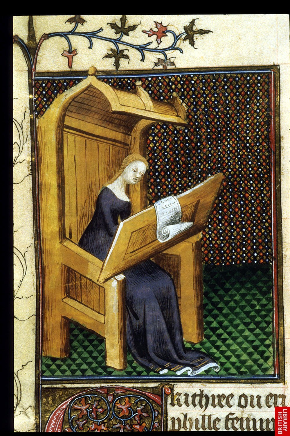Christine de Pisan, poète, écrivain, philosophe érudite, est largement lue, publiée et reconnue ; elle se bat entre autre pour la reconnaissance des femmes dans l’histoire de l’humanité. Elle fut aussi conseillère de Charles V et VI. Ici, une représentation de grande qualité de son univers. Il faut remarquer que nous avons ici des textes et illustrations contemporains de l’auteure, comme pour Phebus et Machaut par exemple.