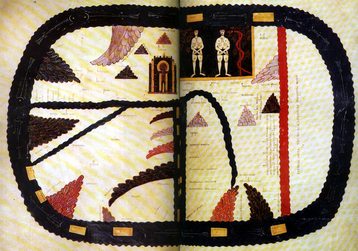 9ème siècle, Prudentius, le sujet est la « psychomachia »humilité tenant la tête d’orgueil!!. Reims, nette tendance illustrative et graphique que l’on retrouvera souvent dans la zone germanique et d’Europe centrale. Cette psychomachie de plusieurs dizaines de pages est remarquable de liberté et d’invention .Le succès de ces allégories moralisante est grand et se prête bien aux images, les vertus et les défauts étant signifiés par des figures distinctes