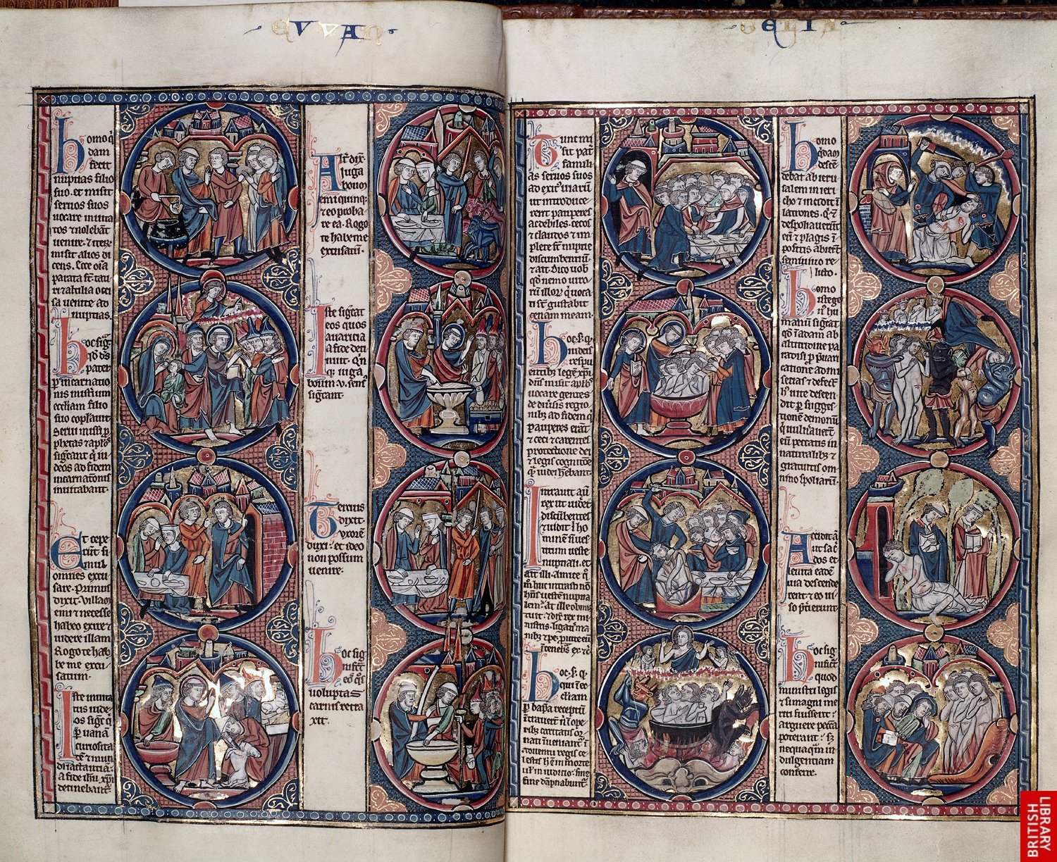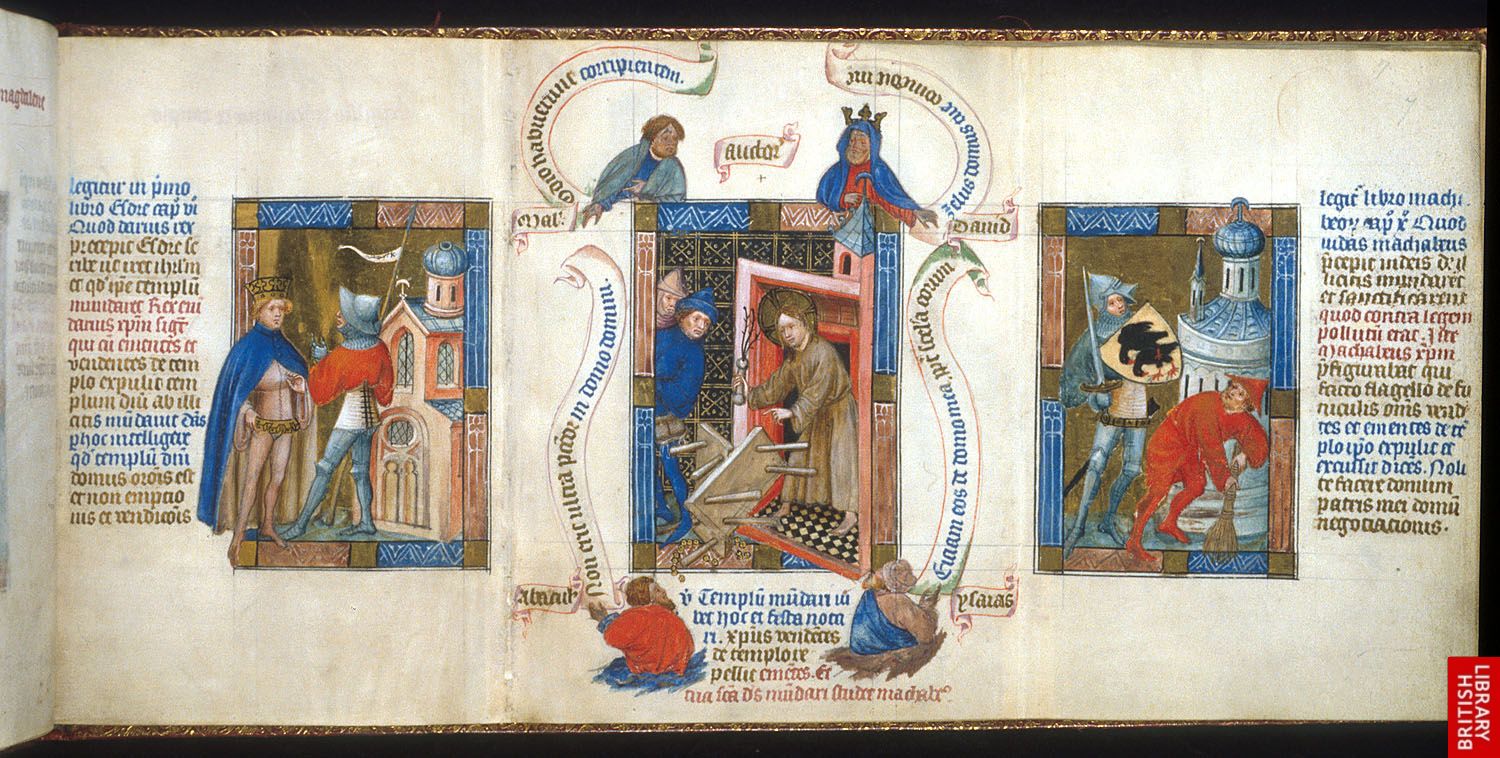 Très belle Bible des pauvres, en trois parties, mettant en parallèle les récits bibliques et évangéliques. Au centre, Jésus chassant les marchands du temple.