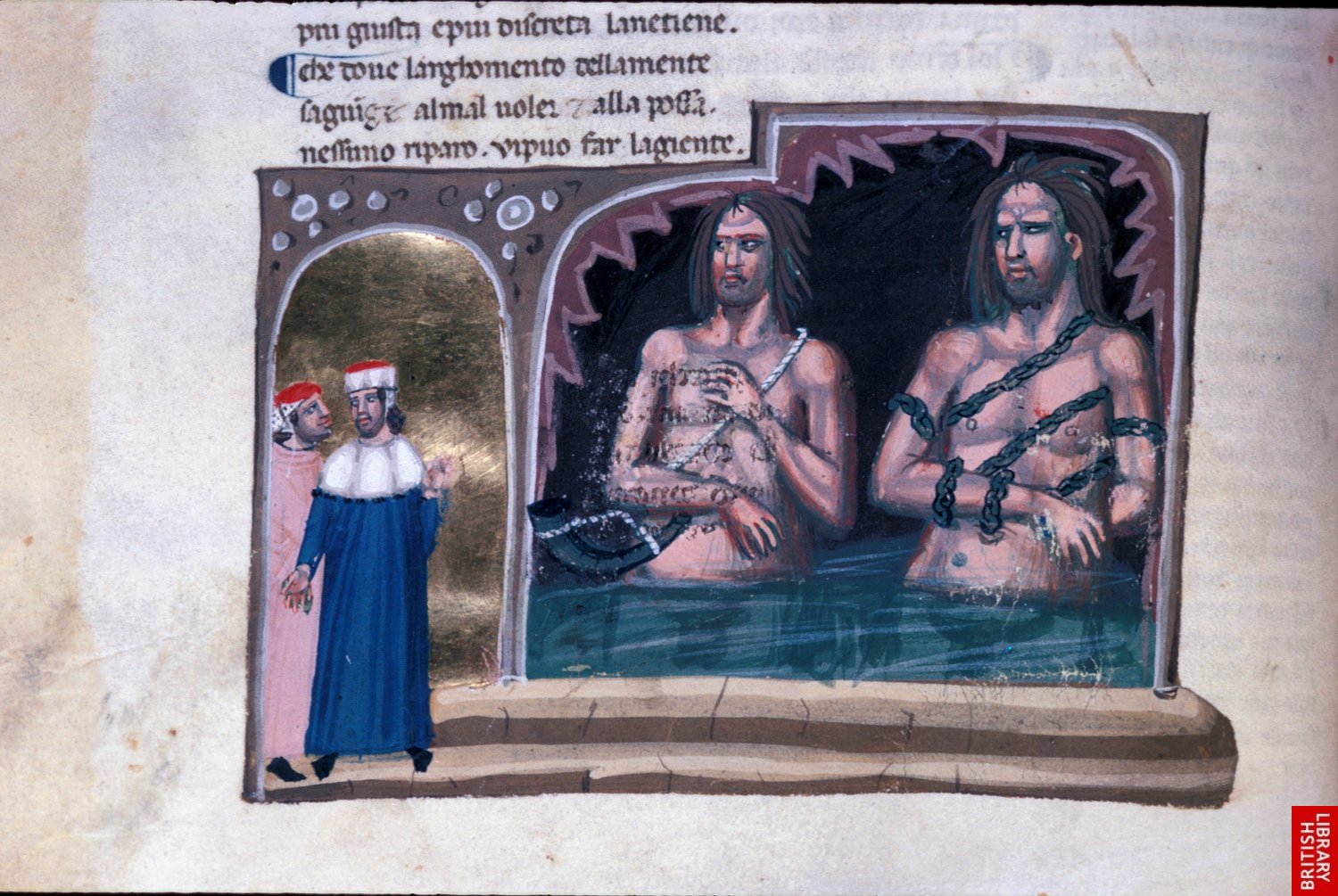 La divine comédie de Dante est évidemment un des textes les plus remarquable, l’un des premiers textes en toscan, il se prête, par son côté visionnaire à d’exceptionnelles images.Cette série du 14e est puissante par les modelés synthétiques et la représentation confinée des espaces. Le bleu profond renforce la mystique des visions. les personnages sont peu déliés, un peu raides, sidérés.