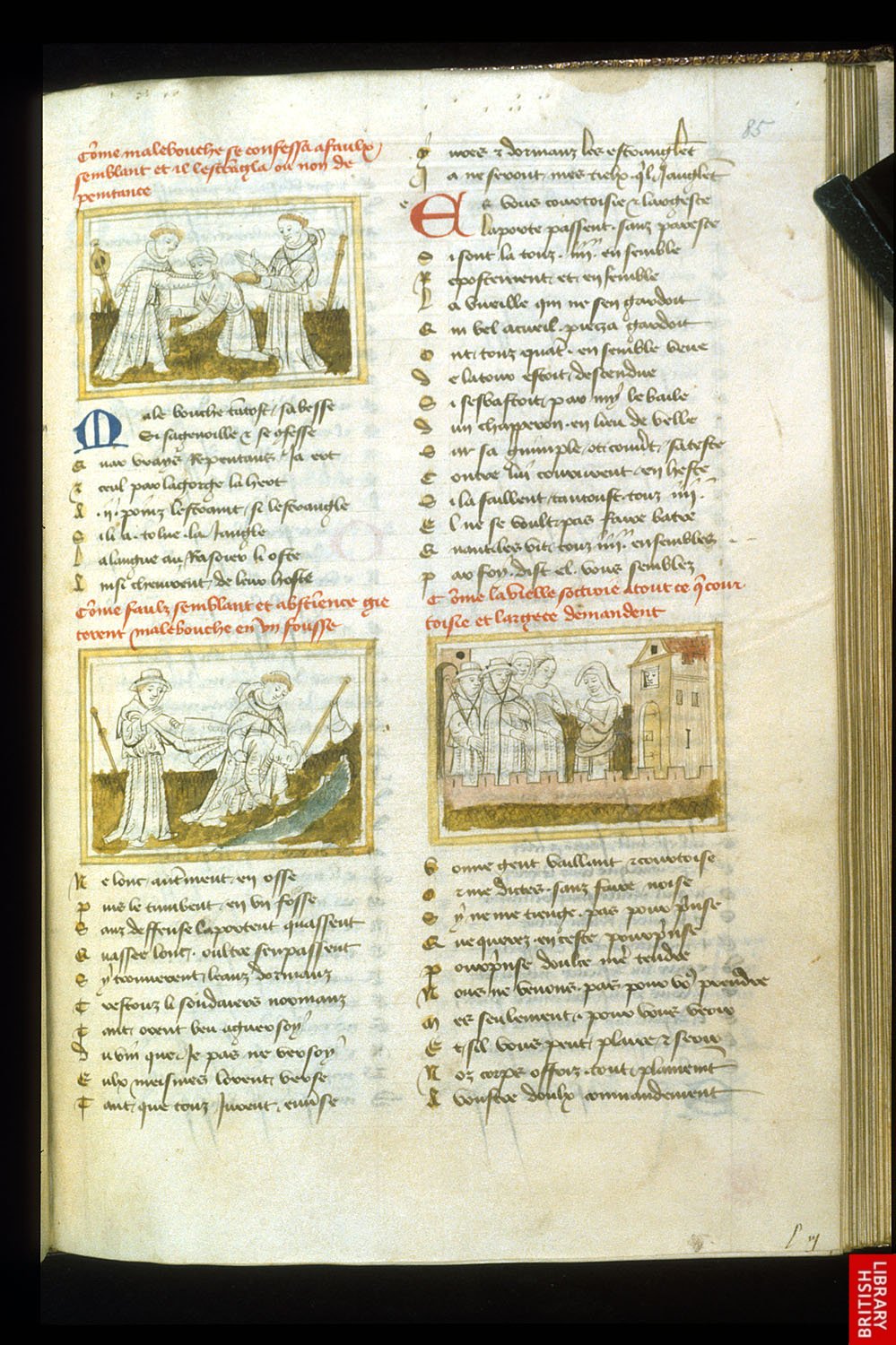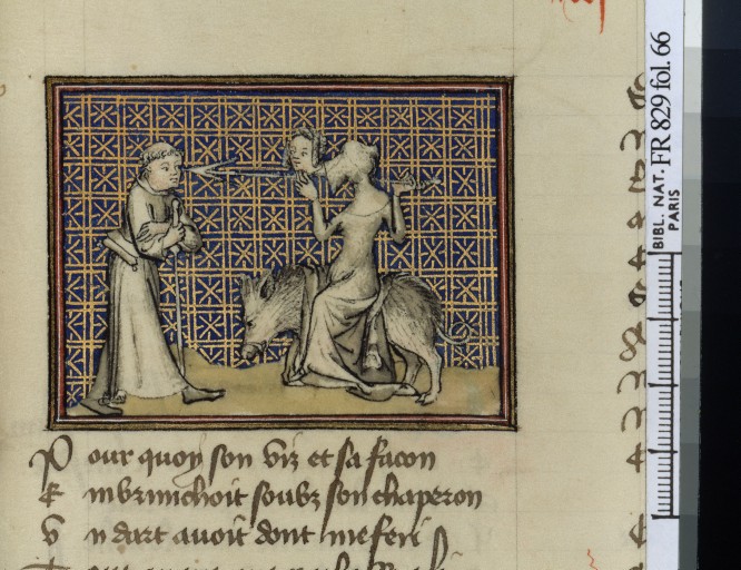 La très célèbre farce de l’ignoble Fauvel ou Fauvain, fable morale par Gervais du Bus, contre les incivils. L’illustration est dans la nature de la charge et de la caricature, ce qui constitue un genre nouveau. Le dessin au trait est justifié,sans couleurs ni dorures, il ne s’agit pas de méditer sur la beauté de ces turpitudes; ici Fauvain conseille la fausseté à ses enfants!!