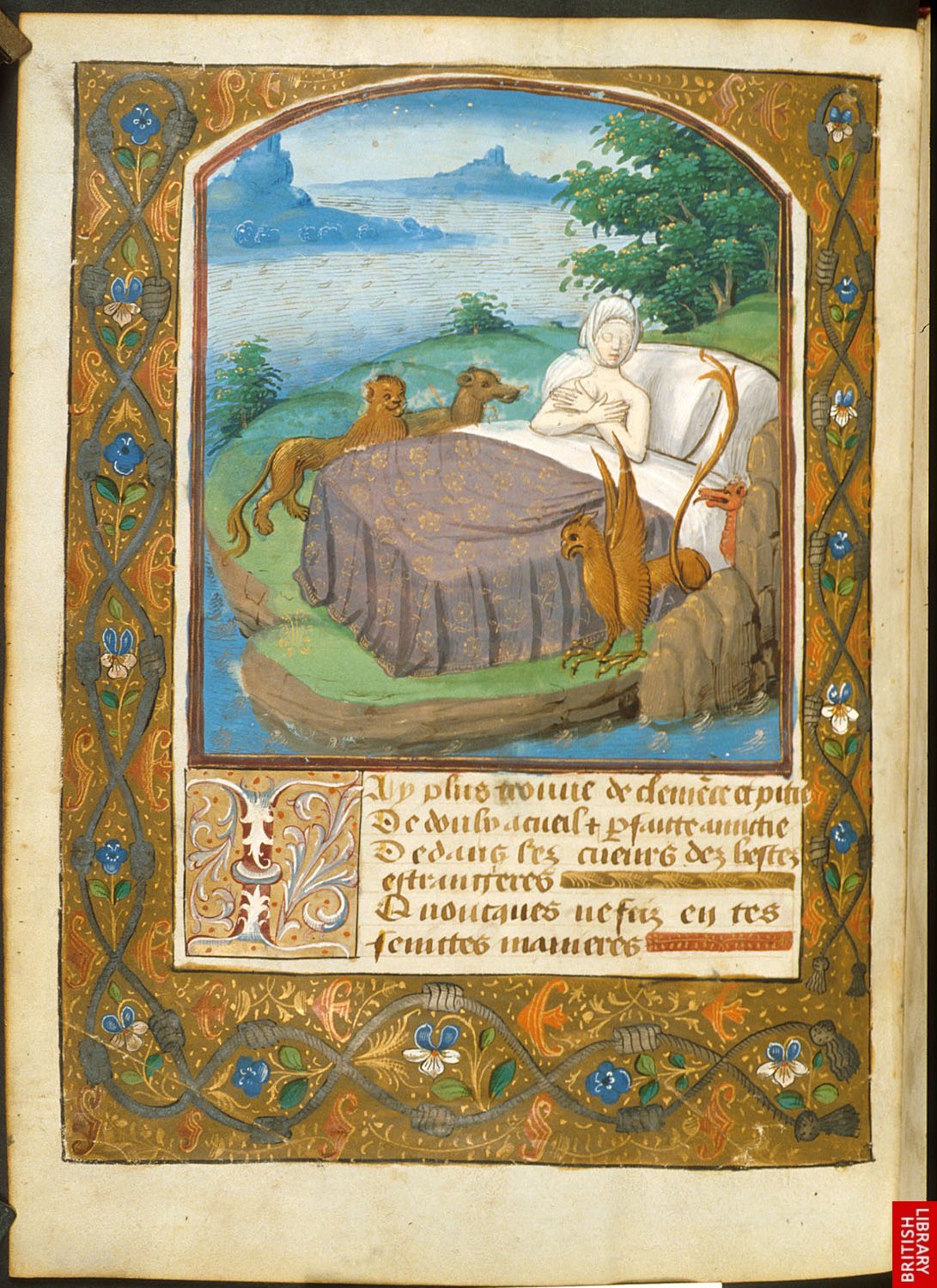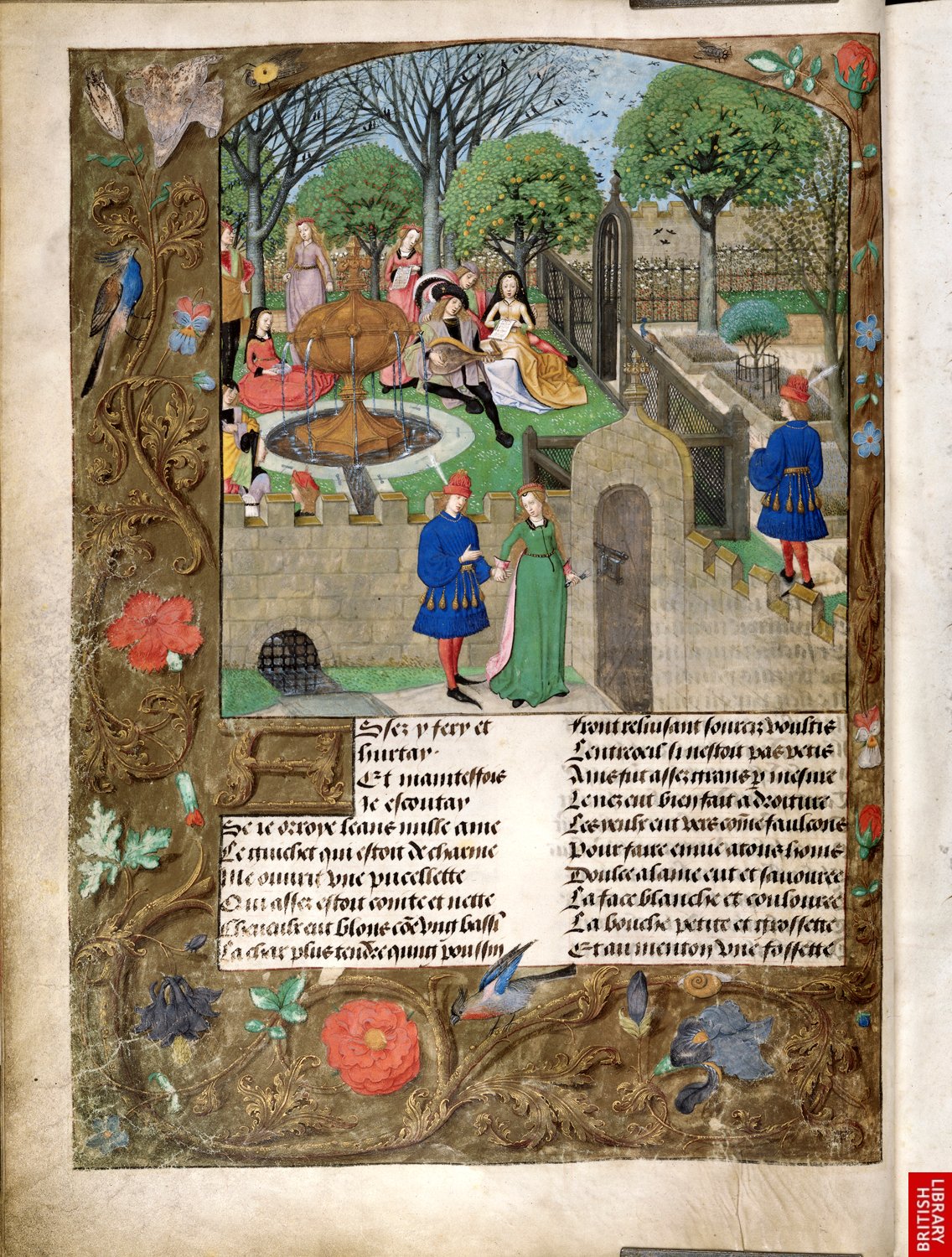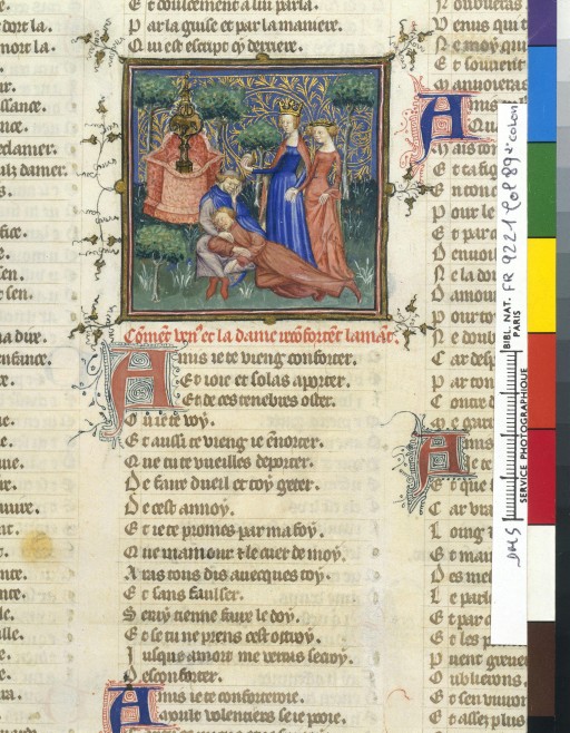 Une page complète du style « français », version du Roman de la Rose, roman très fameux, mais critiqué par C. De Pisan et Guillaume de Digulleville….On voit clairement la densité des motifs non narratifs, véritables fugues, qui reprennent la tradition des entrelacs de contemplation des manuscrits nordiques.