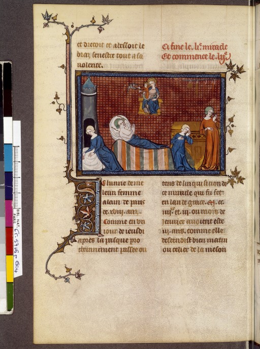 14e. Un genre qui se répand après la légende dorée de jacques de Voragine est le livre relatif à la vie des saints ;ici, Louis 9, sanctifié et popularisé par de nombreux miracles comme celui de Jeanne de Melun! image très illustrative, dans un style commun sur lequel nous reviendrons plus loin.