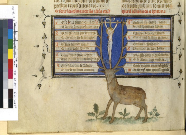 Traité de chasse d’Henri de Ferrières, ici, les commandements de dieu…avec le cerf de St Eustache. Représentation assez proche du Gaston Phébus.