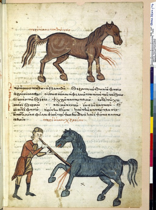 Traité grec d’ hippiatrie du 14ème. ( ce traité, comme les autres comporte plusieurs dizaines de pages), ici, les douleurs à l’épaule. On constate dans ces manuscrits, un certain naturalisme, absent des représentation sacrées.