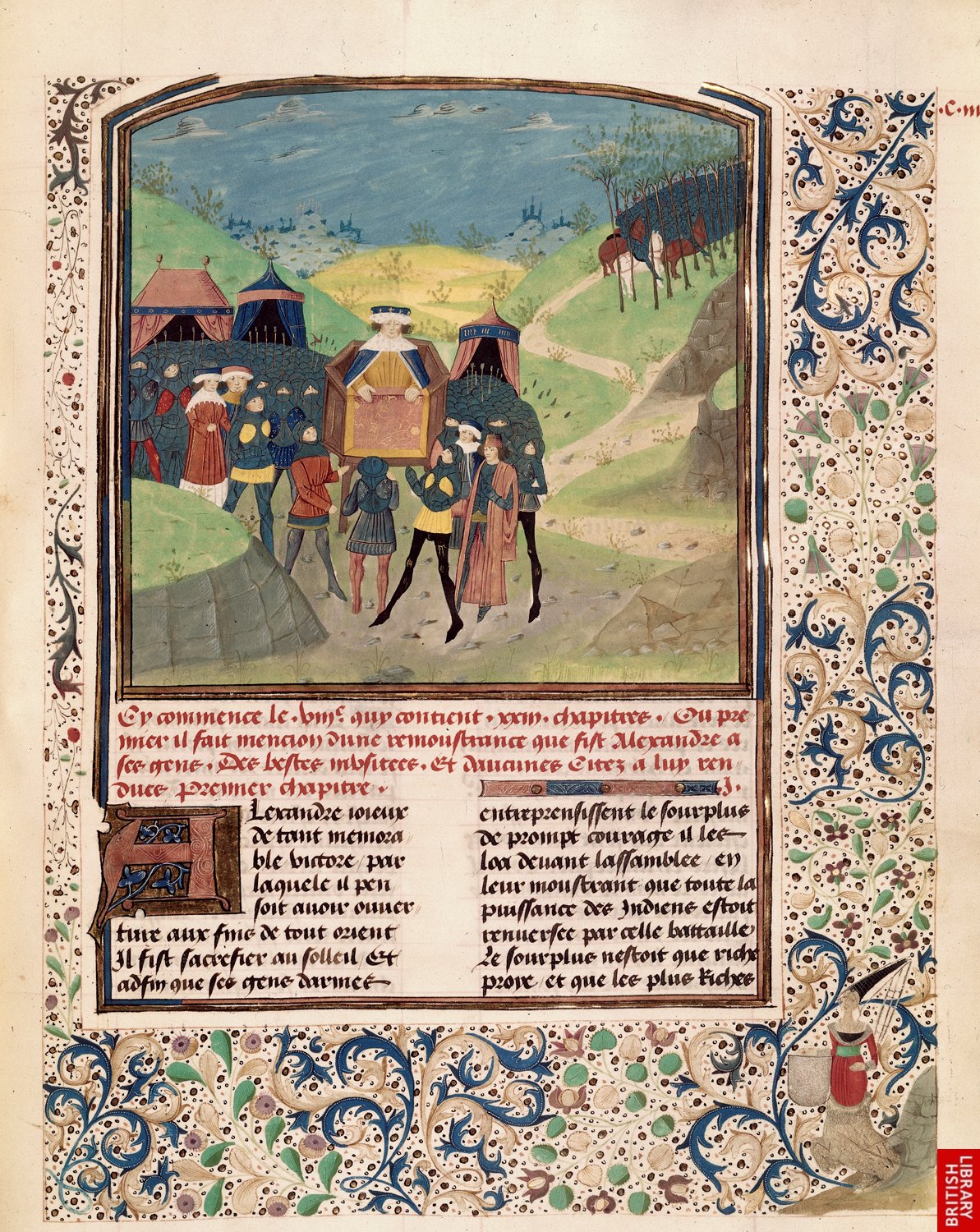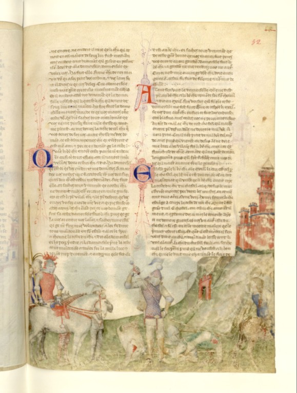 Alexandre, le plus remarquable des « chevaliers » ; le Roman d’Alexandre est l’un des récits les plus diffusé. Ce manuscrit italien du 14e est nettement différent des précédents par sa volonté d’inscrire les scènes dans un espace paysager et naturel.