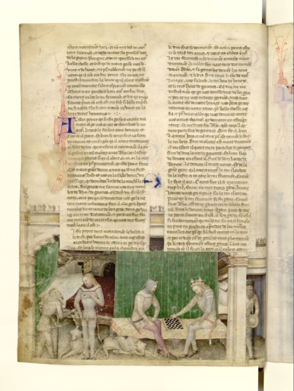 Une autre page du même manuscrit – Malgré les erreurs de perspective, la représentation empirique de l’espace est très efficace. On commence à produire des enluminures se rapprochant des tableaux.