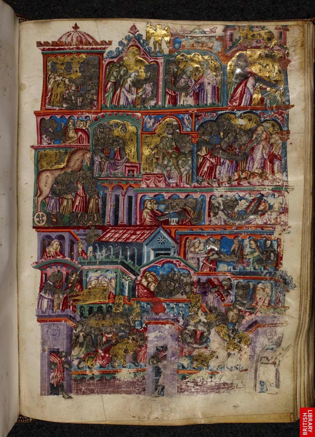 Manuscrit napolitain du 14e ; dans un style très singulier, une chronique populaire de l’histoire ancienne jusqu’à César ; ici le sac de Troie!! Les couleurs acides et la stylisation des figures sont exceptionnelles, tout comme ces pages entièrement peintes.