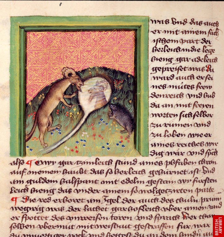 14e Ulrich von Pottenstein, le miroir de la sagesse, recueil de fables illustré avec grande délicatesse, mêlant sens du volume, couleurs subtiles, fond ouvragé et représentation perspective de l’espace ; ici le bouc et le hérisson.On remarque que la plupart de ces textes sont en langue locale, italien, français, allemand etc.