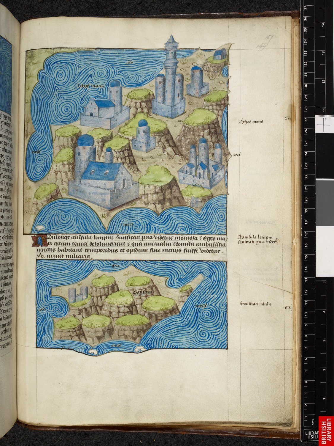 D’après Diodore de Sicile, un atlas complet de toutes les îles grecques….maîtrise progressive de l’espace réel et de l’espace figuré; la représentation en perspective cavalière démontre la capacité progresseive à choisir son point de vue, au sens strict. Vinci fera de même pour ses élévations magnifiques du territoire toscan. La conquête progressive du monde passe par sa représentation. Ici, le Mont Athos!!!
