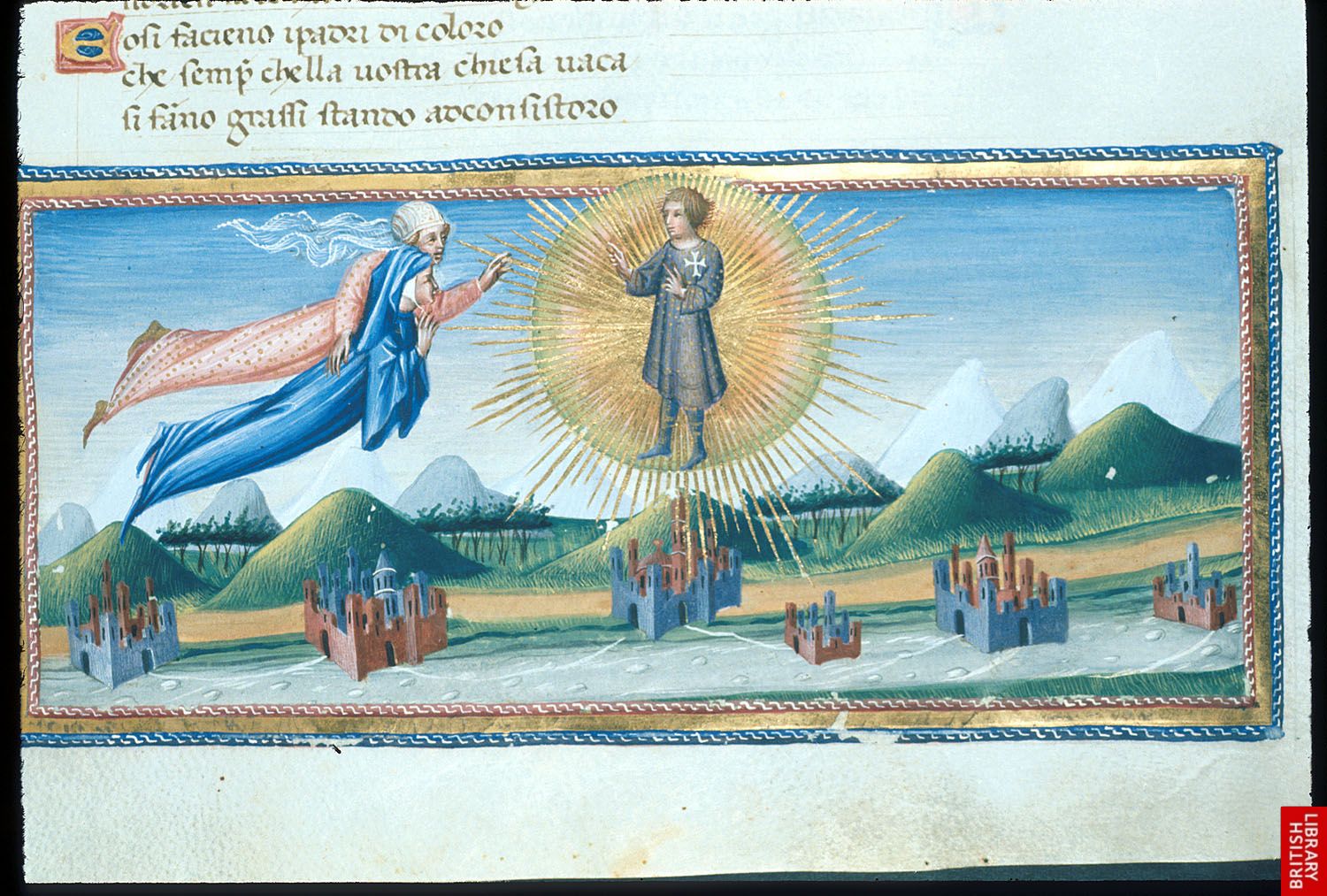 Dans ce manuscrit italien, de la Divine Comédie, on remarque clairement la culture déjà très avancée en Italie de la représentation de l’espace, des éléments paysagers et même climatiques ; les couleurs et l’art de l’espace ouvert.