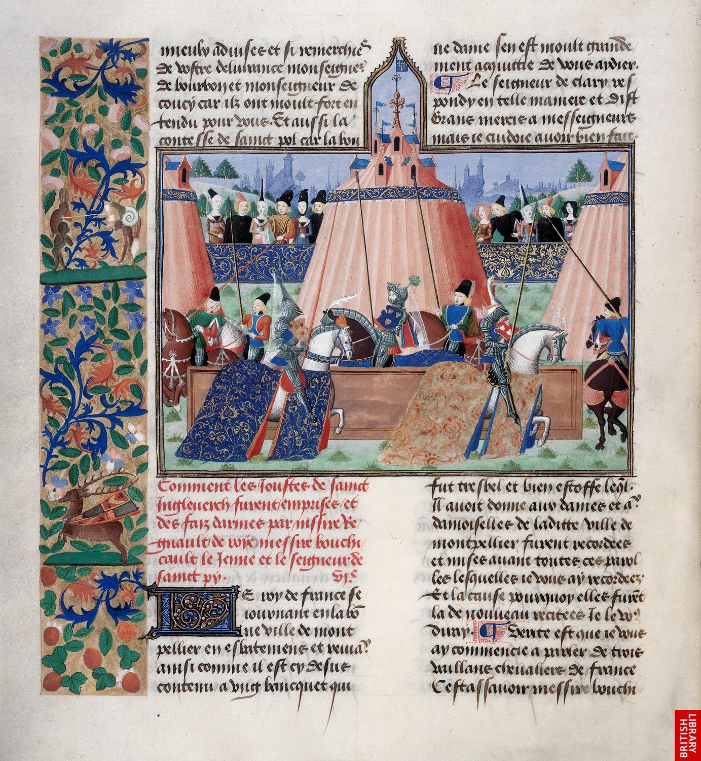Les chroniques de Froissart encore, on repère bien l’inscription dans l’espace tridimensionnel, la miniature devient un petit tableau, une petite fenêtre et tend à être de plus en lus autonome du texte. L’illustrateur de Froissart sait parfaitement jouer de la composition au premier plan et de la profondeur de champ.