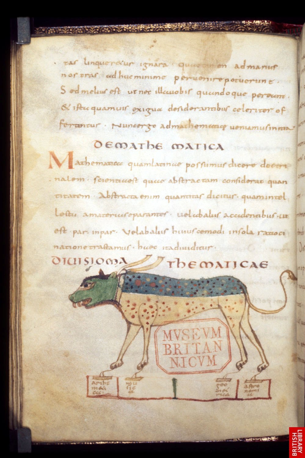 Encore un texte du 9ème, ce manuscrit tiré de Cassiodore, illustre les 4 « jambes » des mathématiques : géométrie, musique, algèbre et astronomie, d’un savoir puissant qu’il faut tenir en laisse!