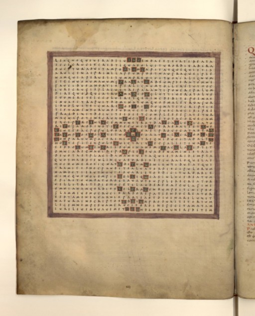 l’une des 28 pages (7X4) de la glorification de la croix par Raban Maur,manuscrit très réputé et recopié pendant des siècles de façon rigoureuse. Essentiellement graphique.