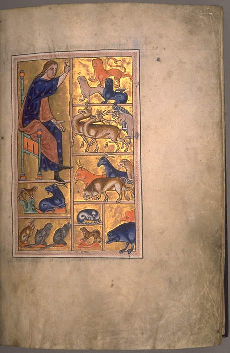 Le bestiaire d’Aberdeen, 13ème ; l’un des plus beaux avec ses fonds dorés à la feuille. Raffinement des modelés et élégance des formes. Ici, la création des animaux. Les bestiaires sont nombreux à partir du 13ème et démontrent l’intérêt croissant pour le monde physique.