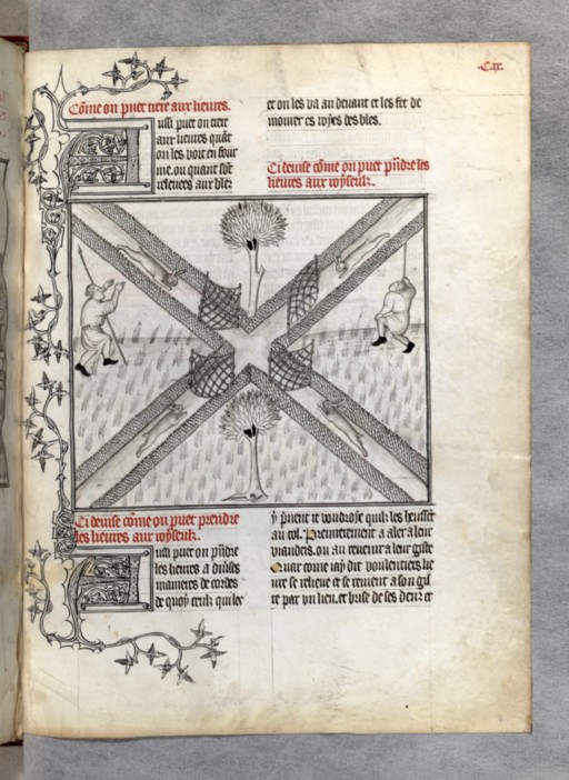 Les extraordinaires traités de chasse de Gaston Phebus sont l’un des sommets de l’art des manuscrits ; ici, une chasse au lièvre monochrome, combinant précision anatomique et cynégétique et paradoxes spatiaux. La scène est tout de même d’une grande clarté.