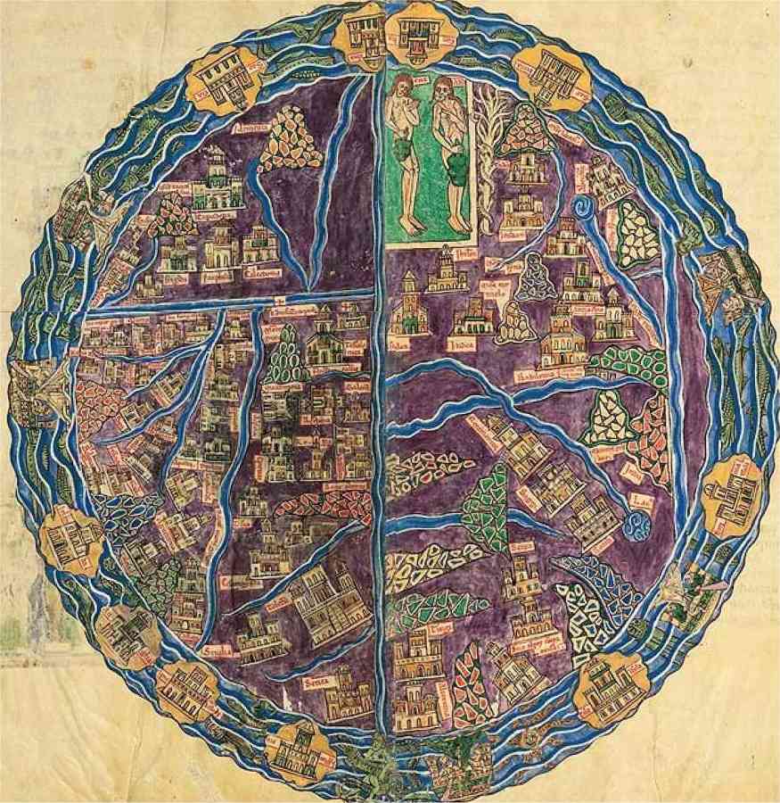 La mappemonde du Beatus de San Andres de Arroyo, unique par sa composition parfaitement circulaire, la où les autres sont en ellipse. Les couleurs naturalistes, sont elles aussi une exception. On repère Adam et Eve dans leur bulle. Noter aussi la double page, qui donne une idée de la dimension de l’oeuvre.